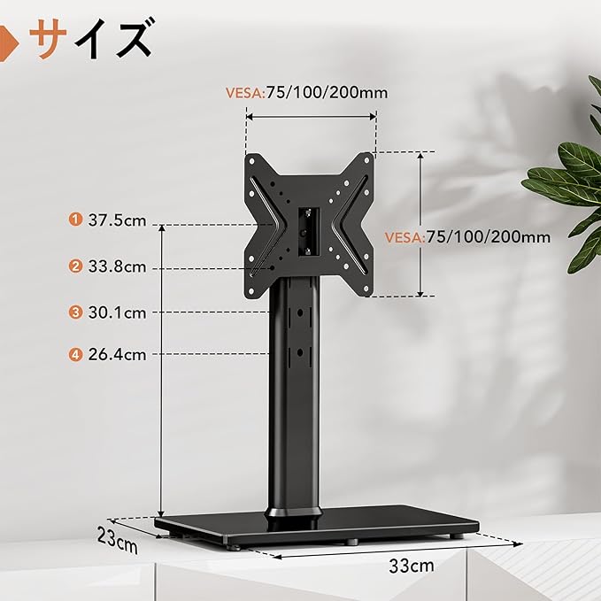 耐久性のある鉄製の楕円形のパネルと8mmの強化ガラスベースで設計された私の安定性フリースタンディングTVマウントは、安全性と安定性を備えたあなたのテーブルにあなたのテレビを簡単に保持できます。 75mmx75mmから200mmx200mmまで、99lbsまで保持可能