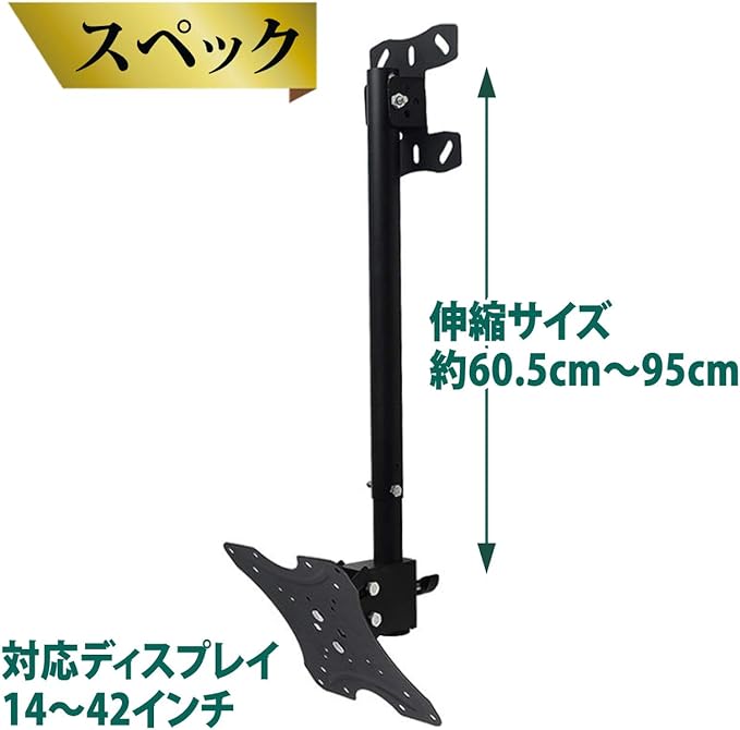 対応ディスプレイ:14インチから42インチ 伸縮サイズ:約60.5cmから約95cm 耐荷重:約25kg ※モニターの環境等により、色の見え方に若干差が生じる場合がございます。