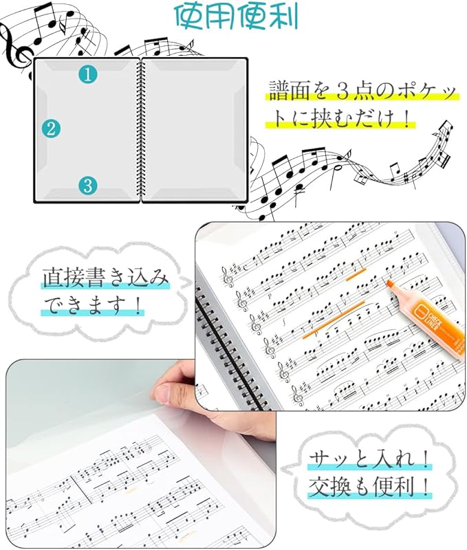 【書き込みOK】譜面の端部のみ挟みますので、ファイルに入れたままメモを書き込みできます。ライトや日光に照らされても反射しなくて見やすいです。