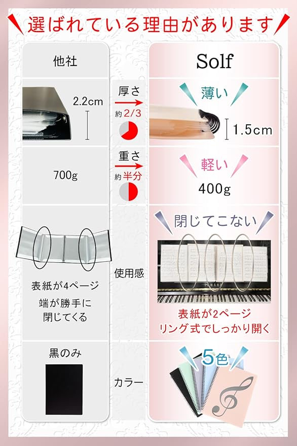 【リング式でしっかり開く】譜面台にピッタリ沿うように立ち、演奏中に倒れません!本の楽譜よりも真っすぐ開きます。