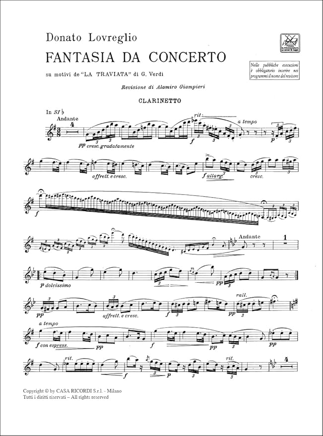 ヴェルディ : 椿姫 ラ・トラヴィアータ 演奏会用幻想曲 (クラリネット、ピアノ) リコルディ出版