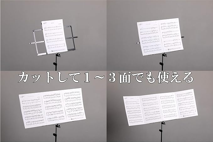 4面で使用する場合、楽譜を貼る前に1面目と4面目の端を1~2mm程カットする(切り落とす)ことで観音開きに折りたたむことができます。