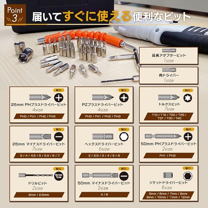◇DIYの強い味方! ビット45個+本体+USBケーブルの47点セット! DIYに必要なほとんどのビットがそろっています。