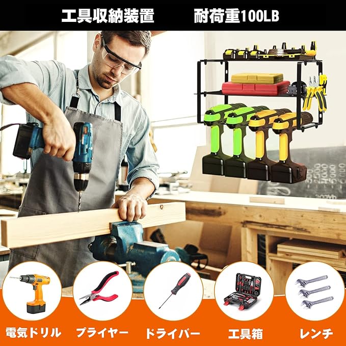 電気ドリル4本収納可能なタフネス仕様。 各種電動工具は壁面にすっきり収納します。