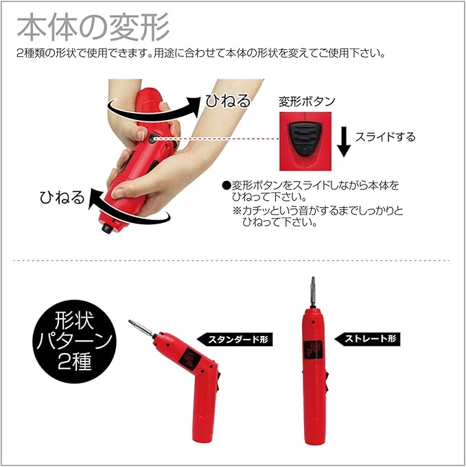 シーンに合わせて本体を変形できる充電式電動ドライバー