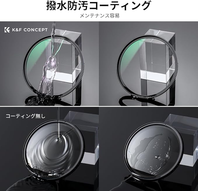 【撥水 防汚】撥水(WPC)加工、撥水効果のあるレンズフィルター、軽く拭くだけで簡単に水滴が消え去ってくれます。指紋がつきにくく、汚れても簡単に拭き取れます。貴重なレンズをしっかり守る保護フィルターです。