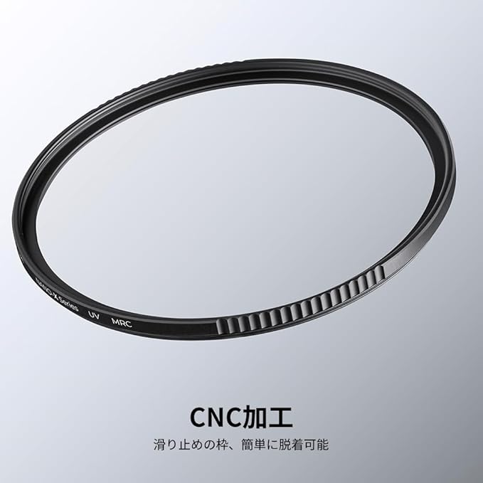 【低反射率 高透過率 高解像度】光学ガラスを採用し、レンズの色特性に影響を与えないMCレンズガードと、UV(紫外線)をカットするMCUVタイプフィルターです。MCとはマルチコートの略で、レンズ表面に反射防止膜を蒸着し、余計な反射光を抑えます。28層コーティングを行うため、99.6%という高い透過率を誇ります。フィルターの枠はアルミ合金製、軽くて、枠の厚さが薄く作られており、ケラレの心配が少ないため、広角レンズに最適なレンズフィルターです。プロ仕様の高精度なレンズ保護フィルターです。