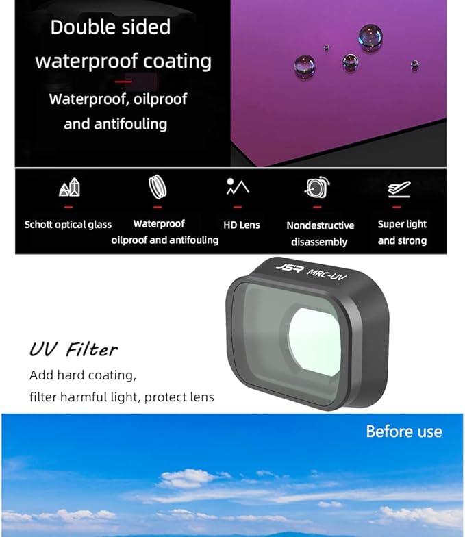 適用対象:DJI Mini 3 Pro 安定した光学特性と高い均一性を備えた光学ガラス素材が好ましい。 多層コーティングは、より鮮明な画像を得るために紫外線と迷光をフィルタリングできます。
