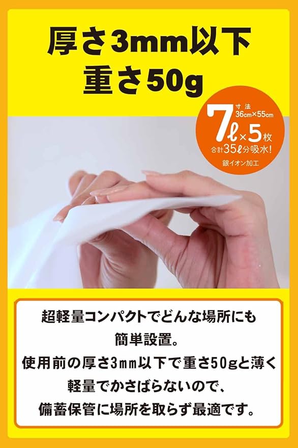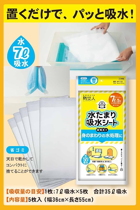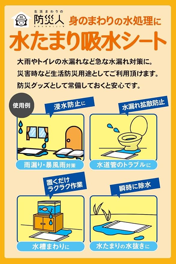 大雨やトイレの水漏れなど急な水漏れ対策に備えて安心の吸水シートです。災害時など生活防災用途としてご利用頂けます。防災グッズとして常備しておくと安心です。