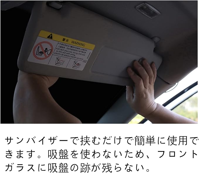 サンバイザーで挟むだけで簡単に使用できます。吸盤を使わないため、 フロントガラスに吸盤の跡が残らない。