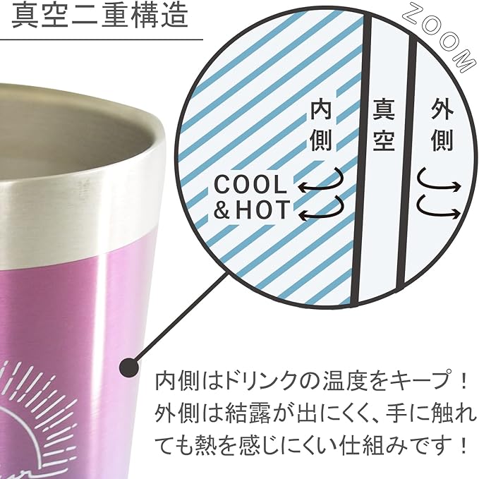 【保冷・保温効果の高い真空二重構造】 飲料の美味しい温度を長くキープ! また、冷たいものを入れた際は結露が出にくく、温かいものを入れても外側が熱くなりにくい構造です。
