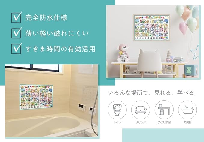 【お風呂場学習はバツグンに効果的】お部屋のように目移りするものが少ないお風呂場は、とっておきの学びの空間です。 学習要素を取り入れることで、おふろ遊びの中で自然と学びの効果が生まれます。 本商品は、お湯や水で濡らすと何度でも浴室の壁に貼ることができるので、お風呂でリラックスしながら楽しく学ぶことができます。