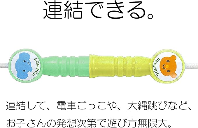 グリップ同士をつなぐことができるなわとびです。電車ごっこもラクラク! ひもが綿製なので足に当たっても痛くないです。商品サイズ:全長約2.2m、柄φ22 108mm 材質:ひも 綿、柄 PP