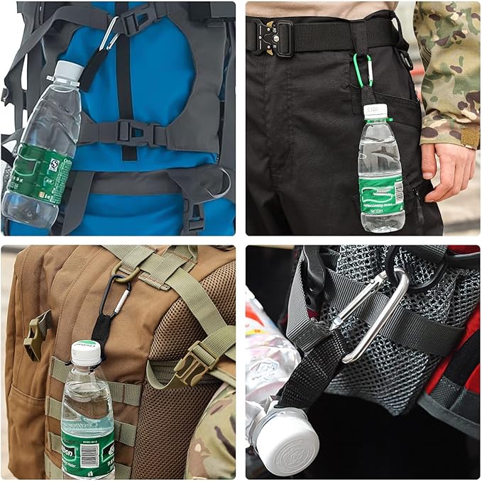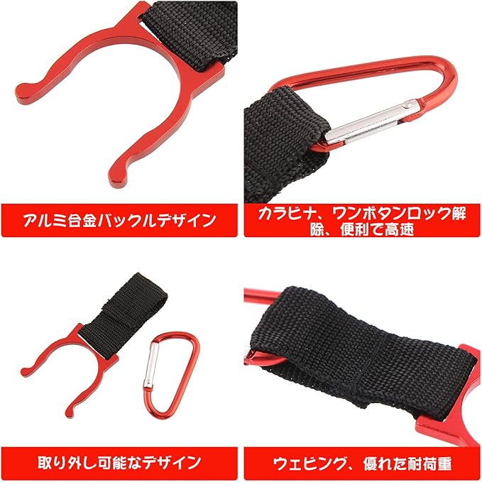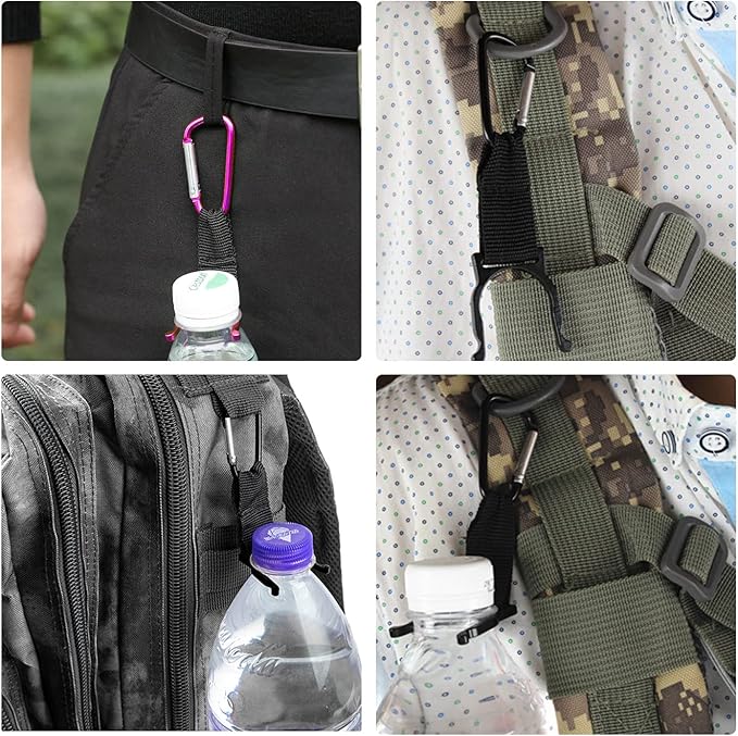 【ペットボトルホルダー】コンパクトなサイズは、簡単に持ち運びます。水ボトルの端にあるリングをプラスチックボトルの上部に取り付けるだけで使用便利です。またカラビナ付きなので、ベルトやリュックの持ち手などにもかけてしっかり固定されています。