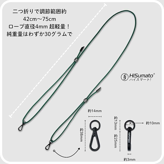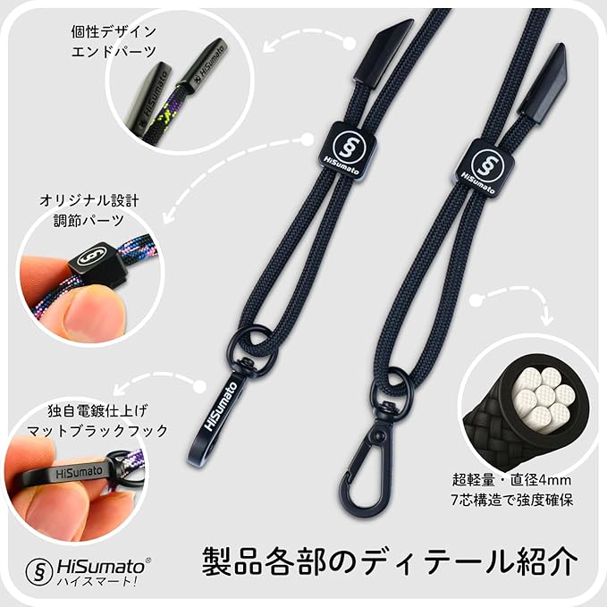 ⑤ 材質:ナイロンロープ(7芯構造)、亜鉛合金(亜ブラック電着)/ロープ直径:4mm /全体の重量はわずか:約30g /長さ調節範囲:42〜75cm