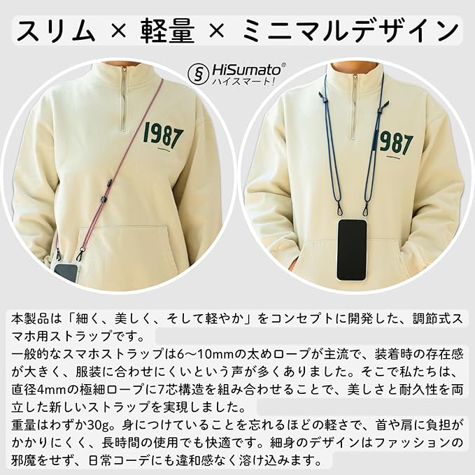 ① 「細く、美しく、そして軽やか」 直径わずか4mmの極細ロープを採用し、軽さはたったの30g。一般的な6〜10mmの太めストラップよりも圧倒的に軽量で、装着時のごわつきや重さを感じさせません。どんな服装にも合わせやすいミニマルデザインです。