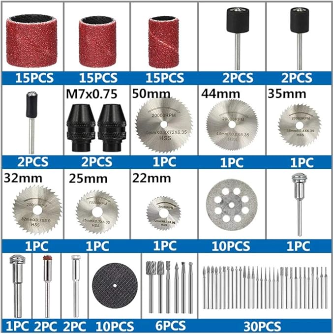 木とプラスチック用のHSSミニソーブレード、石用のダイヤモンドカッティングディスクホイール、金属用の樹脂カッティングホイールの3種類のカッティングホイールが含まれています。