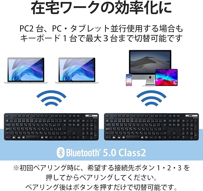 ■省電力を実現するBluetooth(R)5.0 Class2規格に適合しており、Bluetooth(R) 4.0以降に対応したパソコンやタブレットであれば、レシーバ無しで接続できます。※Bluetooth(R)に対応していないパソコンやタブレットでも、規格に適合したBluetooth(R)アダプタを用意することで使用可能です。(推奨Bluetooth(R)アダプタ:LBT-UAN05C2シリーズ(別売))