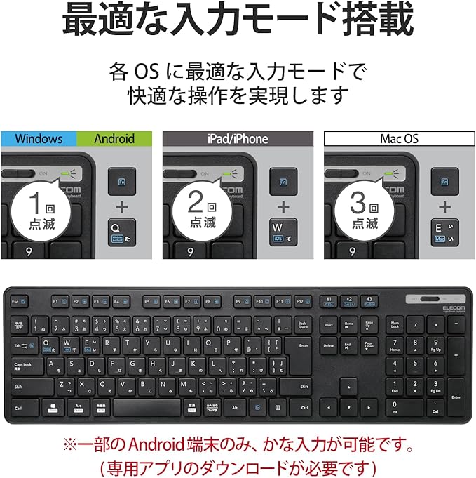 ■Android端末で、キーボードの印字通りのキー入力ができるエレコム独自のアプリ「ELECOM Keyboard layout」に対応しています。 ※AndroidOSは、ご使用端末の仕様によりかな入力ができない場合があります。