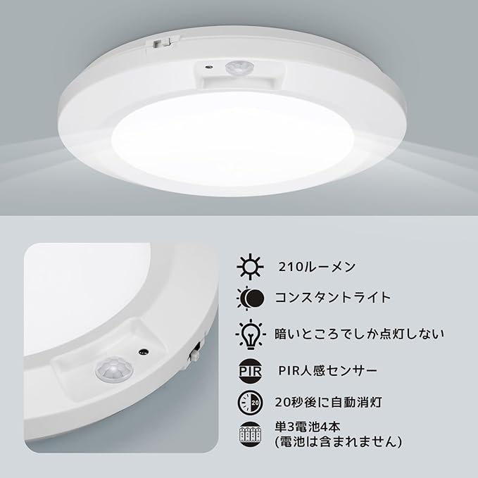 電池式センサー付きの屋内用シーリングライト:スイッチがONモードの時、ライトはどの状態でも常に点灯しています。スイッチがOFFモードの場合、ランプは消灯状態です。(♥注: オートモードでは、ライトは暗い条件でのみ点灯します。)