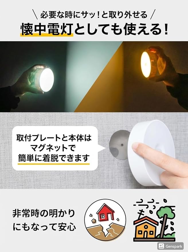 ✅マグネットまたはテープ(※)で取付できるため、屋内の様々な場所(玄関・廊下・階段・物置・クローゼット・トイレなど)でお使いいただけます。【※注意】取付プレートはマグネット側の青いフィルムを剥がしてご使用ください。