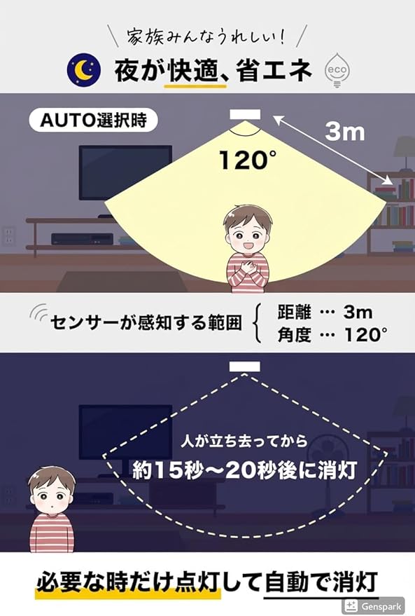 ✅切替スイッチにより、「常時点灯」「感知時のみ点灯」「常時消灯」の3つのモードが選べます。