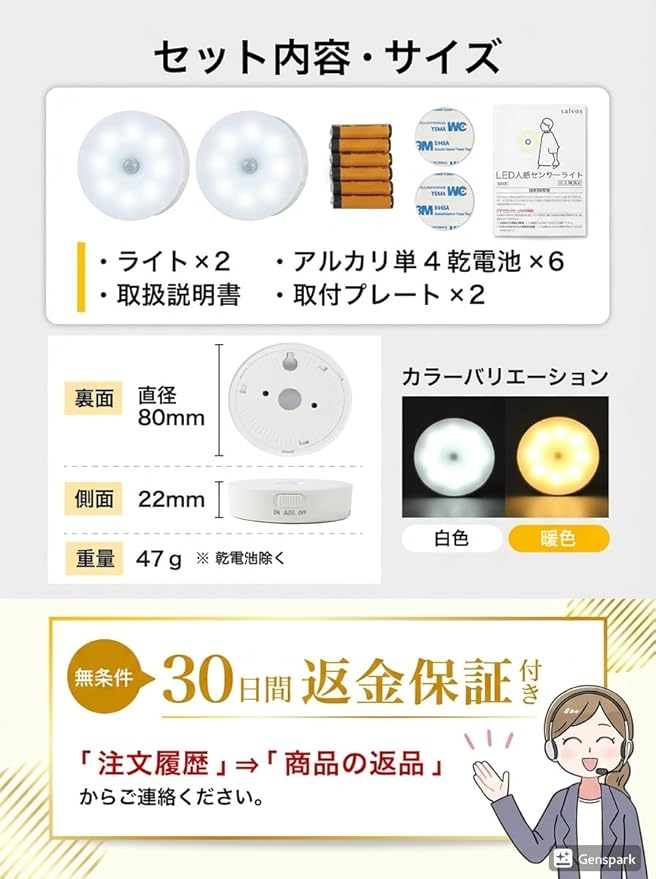 人感センサーライト 室内用 電池付き 明暗センサー付き マグネット付き 小型 2個セット 暖色 salvos