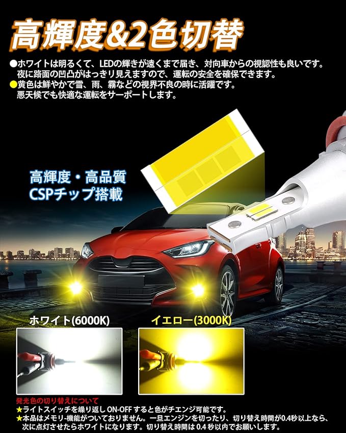 H8/H16(国産車)LEDフォグランプ ホワイト/イエロー 2色切り替え CSPチップ搭載 ファンレス 純正ハロゲンを簡単LED化 光軸調整可能 車検対応 加工不要 DC12-24V H11//H9兼用 無極性 2個セット