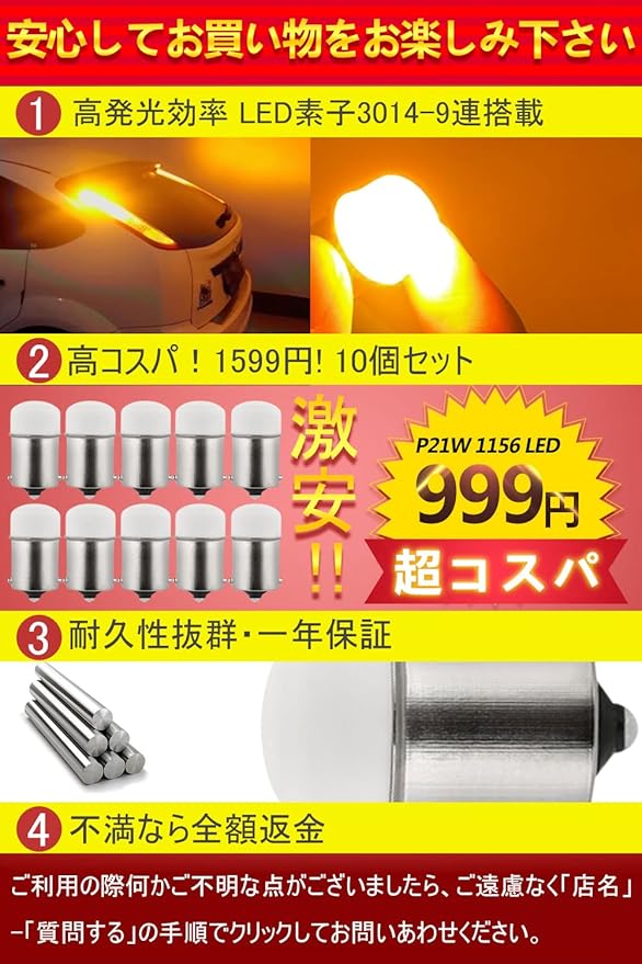 適合型番:1156、BA15S、1141、1003、7506、1095、1156NAなど、多くのソケットに互換。放熱性に優れたアルミヒートシンクを採用し、発熱を抑えてLEDの寿命を大幅に延長。約50,000時間の長寿命と省エネ性を両立しています。