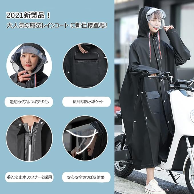 【2021新製品 !大人気の魔法レインコート に新仕様登場!】BUQIRENはお客様の声にお応えし、常に仕様の改良、品質の改良を行っております。2019魔法レインコートに比べ、デザインだけでなく機能も充実♪改良点①止水ファスナーを採用②取り外し可能なダブルバイザー③防水ポケット。防水性、実用性、適用性、ァッション感が全面的にUPしました!