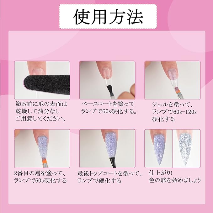 使いやすい✅:広口ボトルのデザインは、キラキラジェルをネイルデザインに便利にします。ネイル初心者にも使いやすい。目的の効果を得るには、2つのレイヤーを適用します。ベースコートとトップコートが必要です。ジェルネイルポリッシュは、ネイルランプの下で60〜120秒間硬化させる必要があります。
