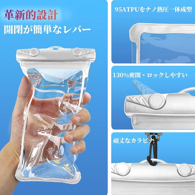 ❀【安全防水IPX8認証!完全防水】IPX8(JIS保護等級8級と同等)、30メートルまで水没しても内部に浸水することがなく、水深10mで2時間の潜水が可能です。革新的で開閉が簡単なレバーは、他の防水ポーチよりも30%強力で気密性に優れています。(※ご注意:念の為、事前に必ずスマートフォンの代わりに1枚の紙を防水ケースに入れ、その後30分間水没させ、水が内部に侵入していないか防水テストを行ってください。)