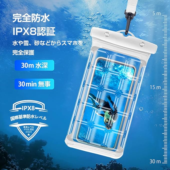 防水ケース スマホ 海【2025強化版&両面高機能】アイホン 水中撮影 完全ぼうすい IPX8認定 SGS国際認証 すまほ ぼうすいケース 保護密封 スマホ保護 防水 全面クリア 透明 タッチ快適 最大6.9インチ対応 通話 小物管理 風呂 海 プール 釣り 雨 潜水 水泳 雪 温泉など適用 (ホワイト)