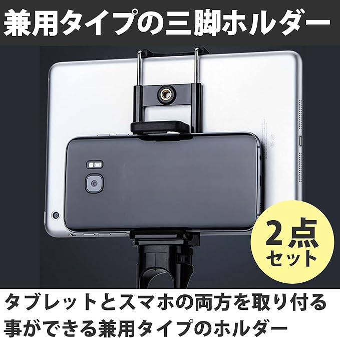 幅広い機種に対応したホルダー:ホルダーの調整幅が広いため、iPhoneやAndroid、iPadmini、iPadAir、SurfaceProなど、さまざまな機種を取り付けることができます。また、2点セットになっておりますので、複数台の機器を使用して撮影したい場合にも活用できるといえるでしょう。
