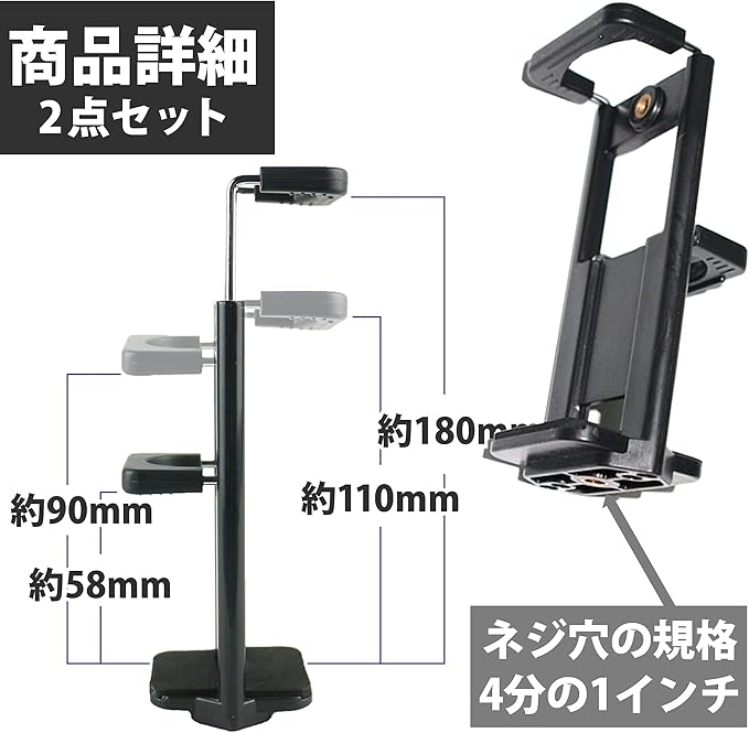 セット内容:2点セット スマホホルダー部分の調整幅:約58mmから約90mmまで タブレットホルダー部分の調整幅:約110mmから約180mmまで ネジ穴の規格:4分の1インチ カラー:ブラック ※モニターの環境等により、色の見え方に若干差が生じる場合がございます。