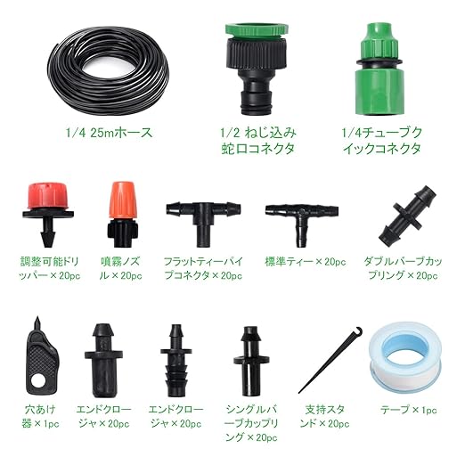 【材質】ABSから作られ、環境にやさしい、無毒、安全で耐久性があります。この灌水ホースシステムには25mホース、ドリッパー、点滴ノズル、噴霧ノズル、蛇口コネクタアクセサリー、クイックジョイントコネクタなどが含まれています。