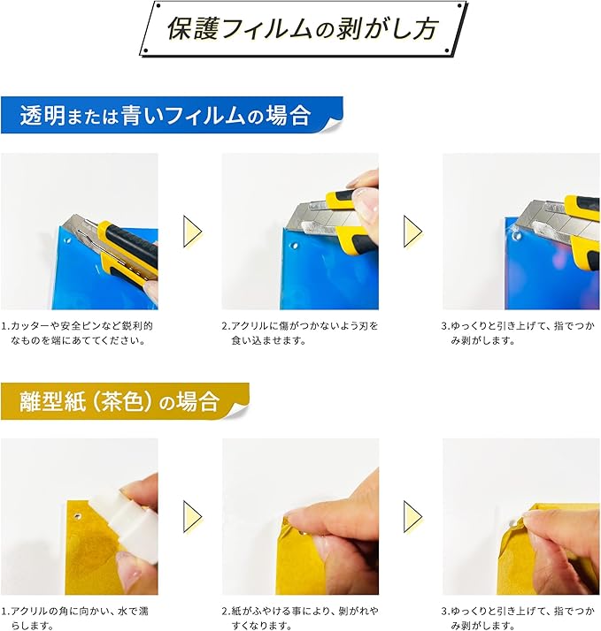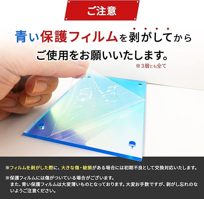 アクリル3層ともに青もしくは赤の薄いフィルムと茶色の紙が付いております。剥がしてからご使用ください。