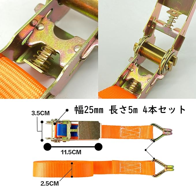 ラッシングベルト ラチェット式 4本セット 幅25mm 長さ5m 破断強度800kg 荷締機 タイダウンバンド 固定用 運搬 引越し トラック 荷台 荷物固定 オレンジ