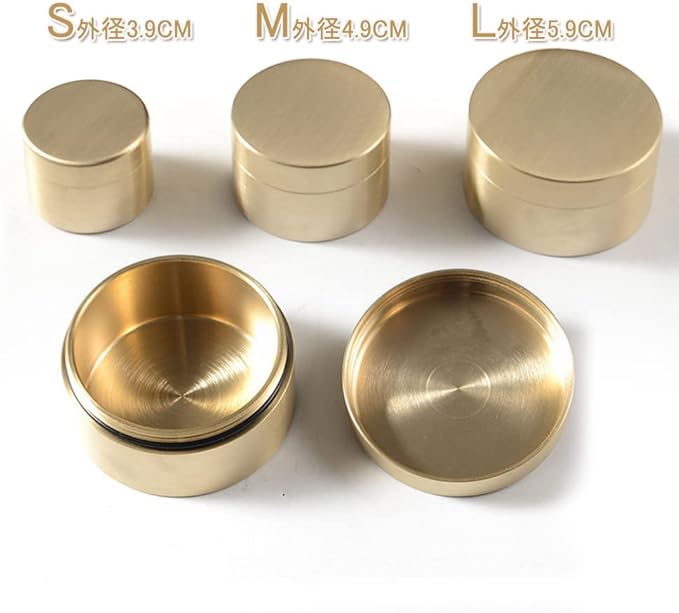 【サイズ】真鍮収納ケース (Sサイズ):高さ3cm、外径3.9cm、キャップ壁厚2mm、キャップ高さ1cm、ボトル高さ2.6cm、内径3.1cm、重さ119g。 (Mサイズ):高さ3.2cm、外径4.9cm、蓋壁厚さ2MM、蓋高さ1.1cm、ボトル高さ2.7cm、内径4.1cm、重さ172g。 (Lサイズ):高さ3.3cm、外径5.9cm、蓋壁厚さ2mm、蓋高さ1.5cm、ボトル高さ2.8cm、内径5.1cm、重さ225g。