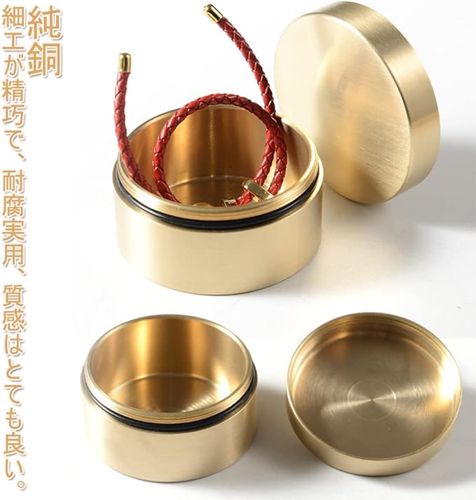 【多用途の真鍮製防水ケース】アウトドアのサバイバルキットとして、マッチ、釣りなどの小物の保管に最適です。コンパクトで旅行などに持って出かける時にとても便利です。蓋の開け口部分にはゴムパッキンが付いており、防水仕様となっております。密封性も高いので、中に湿気が気になる小物をきちんと保管して入れておくことができます。その以外にも、思い出の品を入れるメモリアルケースとしても可能。大切な人との思い出の品や写真等入れて、お守り代わりにも使えます。純銅製の精巧なケースはアクセサリーを収納できる、プレゼントにもいかがでしょうか。重さがあるので文鎮としても使えます。
