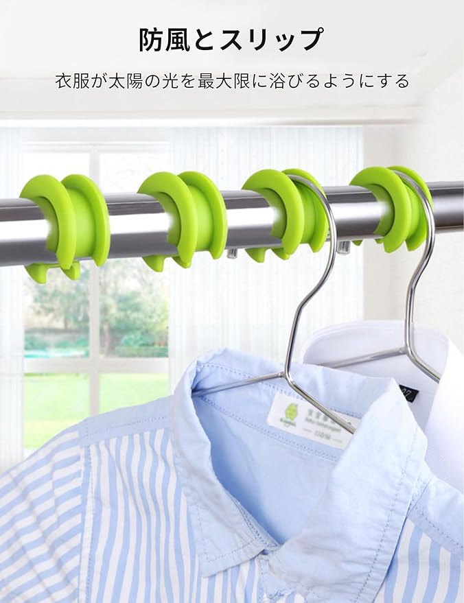 衣服のロープに取り付けてハンガーを固定して、衣服が吹き飛ばされたり押しのけられたりしないようにします。