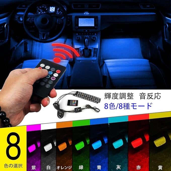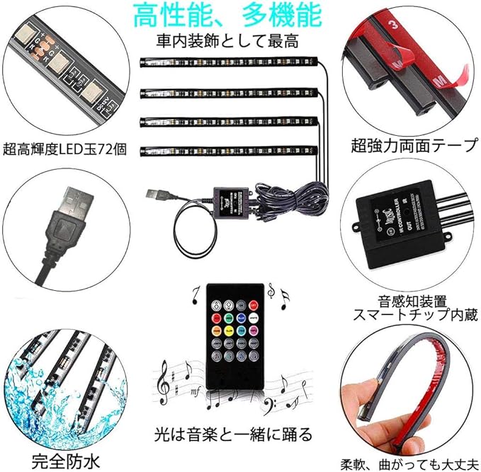 車内LEDテープライト 車フットランプ 車内デコレーションライト 音に反応 8色RGB 8種モード LED電球72個 超高輝度 防水 リモコン操作 設定不要 工事不要 USB充電 【文君の店】