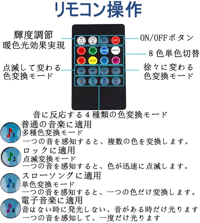 ♫【8色+8種モード、輝度調節】赤、緑、青、白、オレンジ、黄、灰、紫という8色を自由に切替でき、輝度も調節できます。ゆっくり変わる、早く変わる、だんだん変わる、点滅して変わるという色が自動的に変わっていく4種類のモードと音に反応する4種類のモード、計8種類のモードを設定できます。