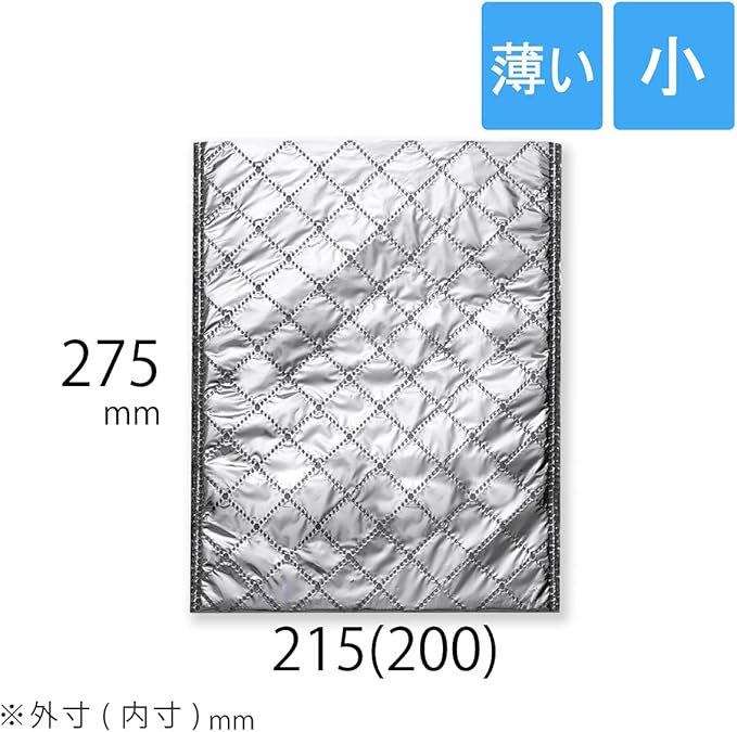 (内側アルミ+中は不織布+外側アルミ) 薄手タイプの保冷袋。 他社類似品(アルミ+ミラーマット)より薄いですが、内側にもアルミ生地を使用しているので、遮光性、保冷効果がアップして他社類似品と保冷性機能は同等ぐらいです。 キルティング風の加工が施してあります。薄手タイプですので他社類似品より保管場所をとりません。 保冷剤と併用してご使用ください。 ※サイズにはご注意ください。平袋なので余裕がないとはいりません。 ※内テープ無し ※手穴無し