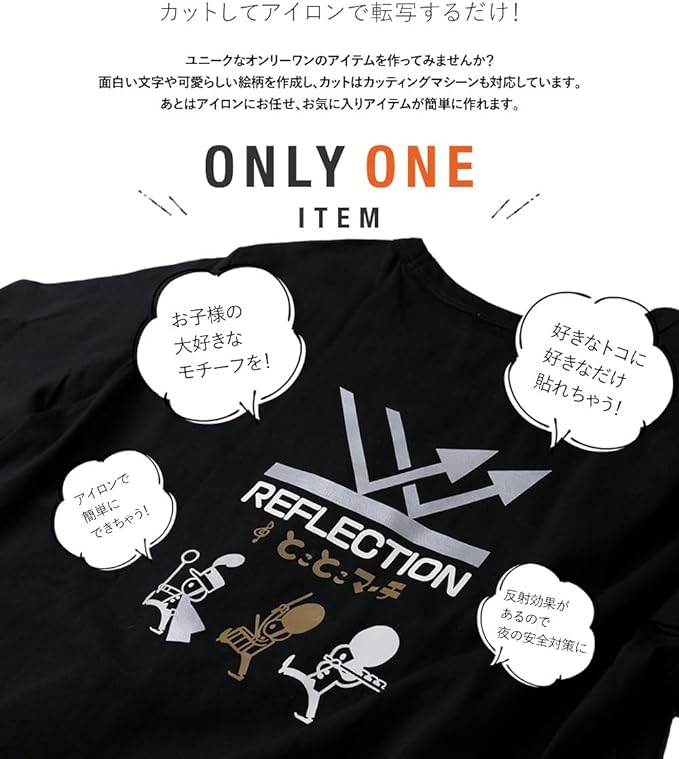【サイズがぴったりサイズではございません。mm単位でのサイズのばらつきあり/長さは少し長めにカットしております】 綿やポリエステル素材を推奨しますが、確実な接着を保証するものではありません。※生地の種類や状態によっては、接着できない場合があります。必ず事前にテストを行ってからご使用ください。※撥水加工など特殊加工が施された生地や、熱に弱い生地にはご使用できません。・色や種類によって、若干の厚みや質感の違いがあるため、同じカット設定では切れない場合があります。必ずテストカットを行ってからご使用ください。またプレス時間や剥がすタイミングも、色や種類によって異なる場合があります。事前にテストを行ってからご使用ください。 ■使用方法 1)必要な道具を用意します。シートをカットするために、はさみ・アートナイフ・カッティングマシン(お持ちの方)・カッティングマットなどを用途に合わせてご準備ください。また、熱転写時に使用するシリコンシートもご用意ください。※「シリコン樹脂製のクッキングシート」でも代用可能です。2) デザインをカットします。転写時には反転させる必要があるため、カットデータは反転して作成してください。光沢のある面が「剥離フィルム面」となります。裏面(マット側)をカットしてください。 3)カッターやアートナイフで不要部分を剥がし、剥離フィルムに余分なものが残らないようにしっかりカス取りします。4) 転写の準備をします。カス取りが完了したら、Tシャツなど転写したい生地と一緒に、デザインしたシートを透明の剥離フィルムが上になるようにアイロン台の上に置き、位置を調整します。 5)アイロンをかけます。熱いとアイロンシートも溶けやすくなるのでアイロンを弱設定(約110℃)で5~15秒ほど、押さえるようにしっかり当ててください。密着が不十分な場合は、再度アイロンをかけ、プレス時間を延長したり温度を少し上げて調整してください。(「弱・中・強」表示の場合は、取扱説明書またはメーカー情報をご確認ください。) 6)少し冷ましてから剥離フィルムを剥がしてください。※フィルムがくっついている場合は、無理に引っ張らず、様子を見ながら丁寧に剥がしてください。《ワンポイントアドバイス》剥離後に一部が浮いている場合は、再度シリコンシートを重ね、アイロンを軽くかけると密着します。 7)完成です!しっかり圧着できていれば完成です!シートに生地の繊維の凹凸が見えていれば成功のサインです。※本製品は生産工程上、静電気によりホコリが貼る面と剥がす面の間に付着する場合がありますが、使用上問題はございません。