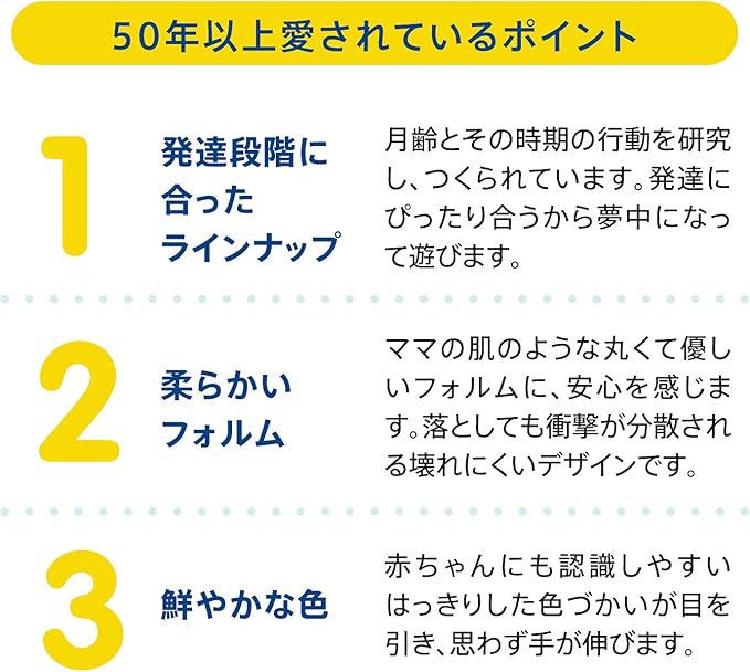 自然と両手で持つ動きを促し、おせんべいのような形は歯固めとしても重宝します。