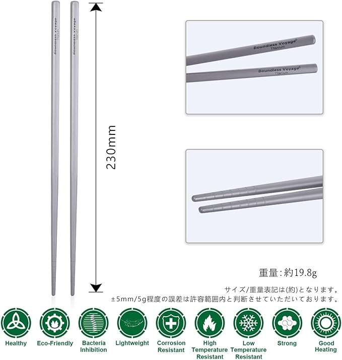 Boundless Voyage角箸は純チタン製で、錆びることはありません。酸やアルカリからの腐食防止性能が優れており、一生使えそうな耐久性が魅力です。健康、環境にやさしい。