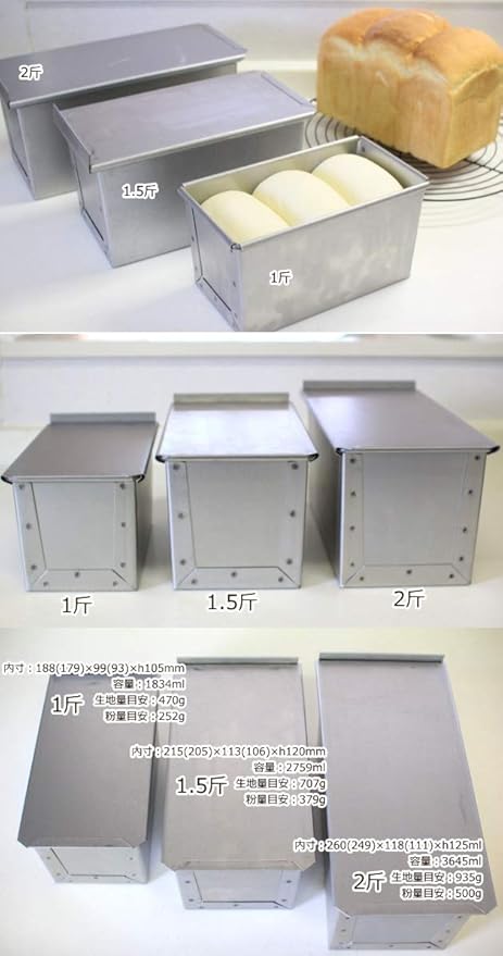 そして、従来の いわゆる定番食パン型の多くは、たとえば1.5斤型は1斤の15倍の容量ではなく1切れのサイズも形も特に統一されていないものが多く、容量もまちまちで使う立場としてもわかりづらかったため新食パン型では 全形と1切れ断面に「ルール」を作り、あくまで各サイズごとに全形としても断面としても良い比率を守り容量は1斤、1斤のほぼ1.5倍、2倍とすっきりとわかりやすく、分量計算しやすくしました。
