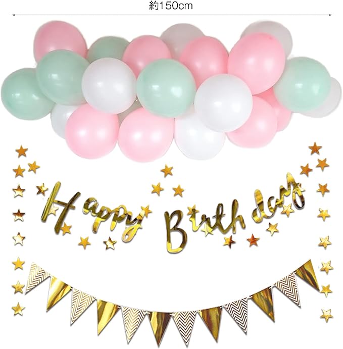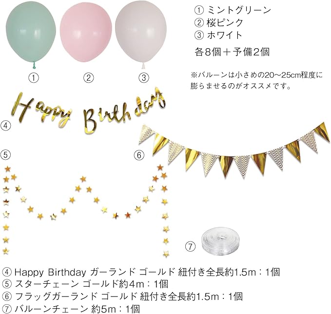 パッケージ内容:ゴムバルーン 3色 ( 各色 8個 + 予備 2個 ) ・Happy Birthday がーランド ( 全長1.5メートル ) 1個 ・スターチェーン ( 全長4メートル ) 1個 ・フラッグガーランド ( 全長1.5メートル ) 1個 ・バルーンチェーン ( 全長5メートル ) 1個