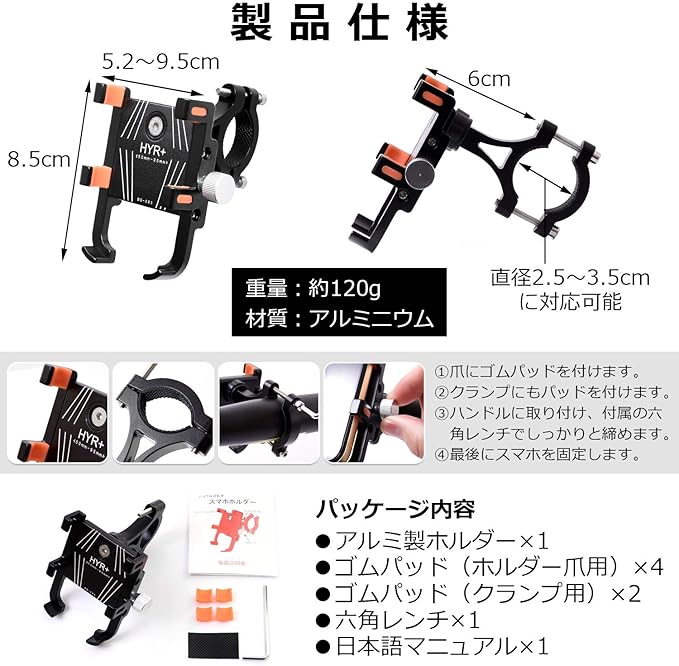 HYR+ アルミ製 バイク スマホ ホルダー 携帯ホルダ 合金 金属 製 マウント ステー 360度 回転 ジョイント 原付 オートバイ